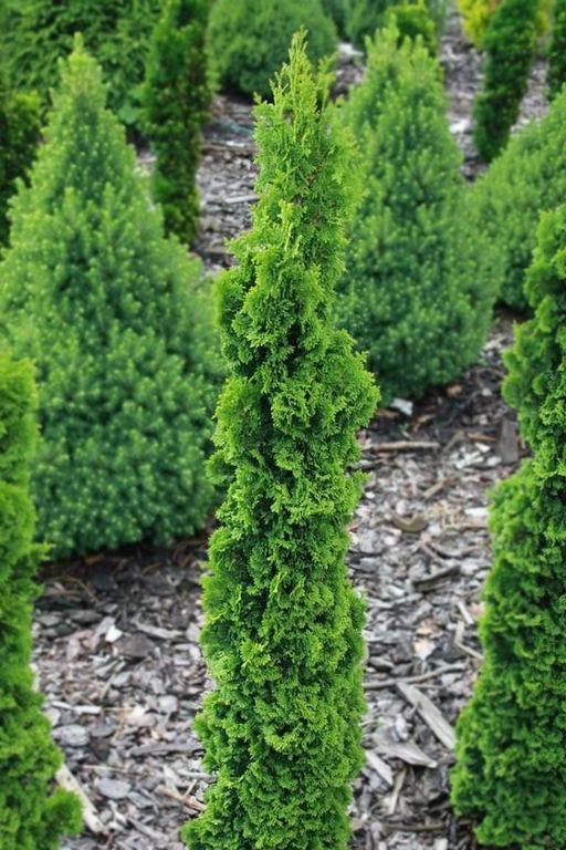Туя западная Спиралис (Spiralis) - отличается своими закрученными в спираль побегами и короткими веерообразными веточками. Хвоя тёмно-зелёная.