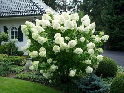 Гортензия Polar Bear - получена в результате скрещивания двух сортов Limelight и Grandiflora, в переводе "Полярный медведь". Главной особенностью данного сорта являются очень большие плотные соцветия длиной до 40 см, конической формы на жестких, сильных побегах. Высота куста 1,6-1,8 м.