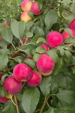 Алыча крупноплодная - сорт российской селекции, представляет собой среднерослое дерево с редкой, раскидистой кроной плоско-округлой формы. Листья удлинённо-овальной формы, с заострённой верхушкой и клиновидным основанием.
