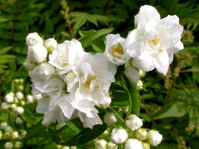 Чубушник Букет Бланк - популярный сорт садового жасмина. Один из гибридов чубушника, созданных фирмой французского селекционера Лемуана.