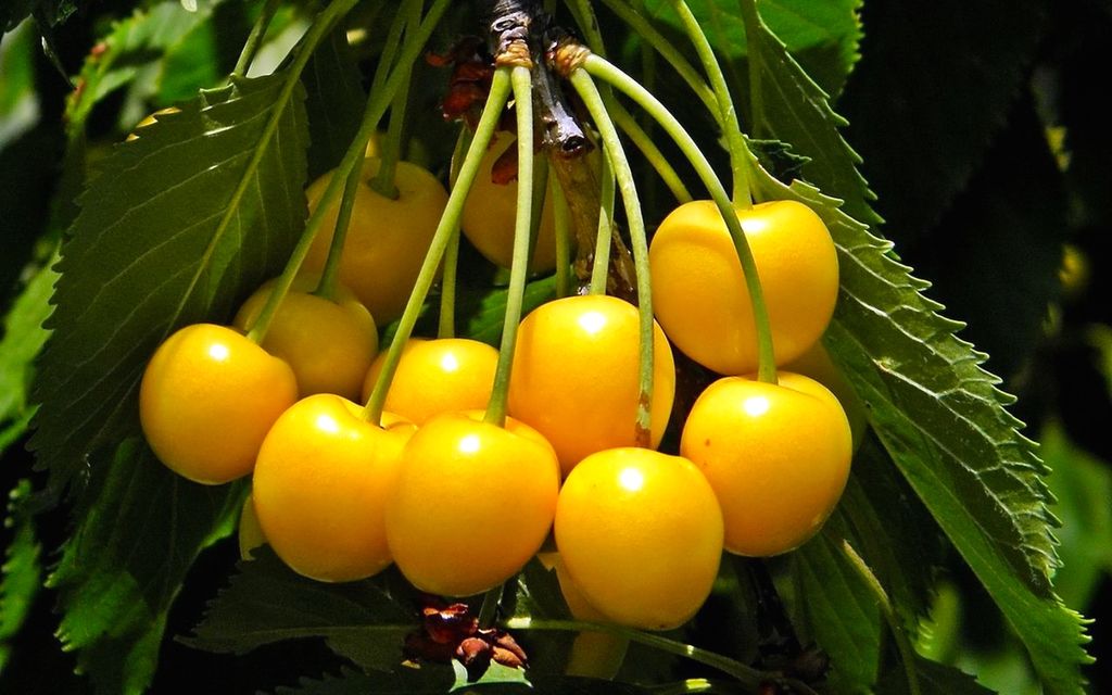 Плоды средней величины, округлой формы, окраска желтая, масса ягод 3,8 г, максимальная 4,5 г. На некоторых ягодах образуется слабый розоватый румянец. Мякоть желтого цвета, плотная, сочная, нежная, вкус десертный, кисло-сладкий (больше выражена сладость, кислинка едва уловима). Косточка среднего размера, округлой формы, гладкая, отделяется от мякоти хорошо.