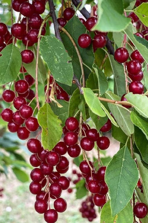Цветки - белые, собраны в свисающие кисти. Плоды от тёмно-красного до почти чёрного цвета. Созревание происходит в августе.