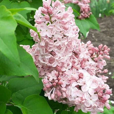 Сирень обыкновенная Вечерний звон - rуст высокий, полураскидистый. Цветки очень крупные (до 3 см и более), простые, с сильным нежным ароматом. Тёмно-розовые бутоны с лёгким шоколадным оттенком, иногда зеленоватые на вершине, гармонично сочетаются с тёплыми нежно-розовыми лепестками. Лепестки с внутренней стороны окрашены в лёгкие кофейные тона, — как тёплый, тихий, ласковый летний вечер, с наружной стороны — с жемчужным отливом.